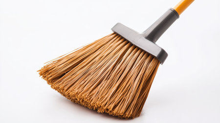A close-up view of a cleaning broom featuring natural bristles set against a light background. This versatile tool is perfect for household chores or professional cleaning tasks.