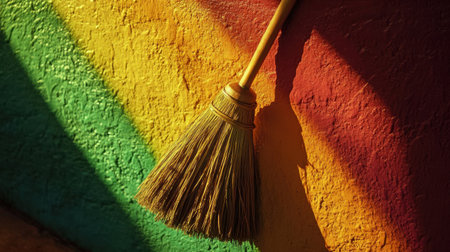A vibrant broom leans against a colorful wall, showcasing striking red, yellow, and green hues. Playful shadows enhance this artistic scene, ideal for home decor themes.