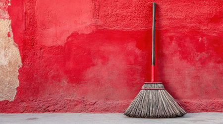 A traditional broom stands against a vibrant red wall, showcasing textures and colors that highlight simplicity in an urban environment. Ideal for cleaning concept.