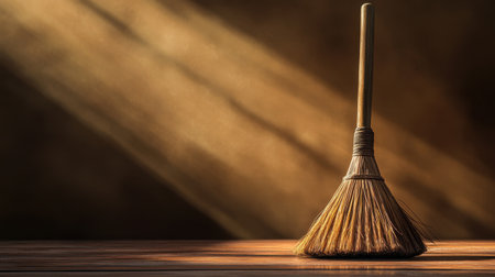 A rustic broom rests on a wooden surface, illuminated by dramatic lighting that creates warm shadows and highlights, showcasing simplicity and elegance.