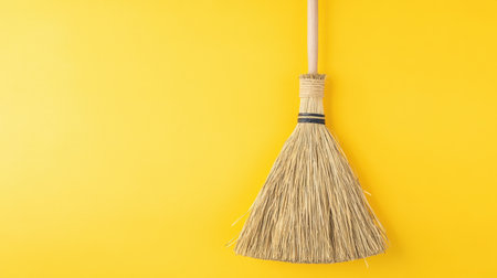 A close-up view of a straw broom resting on a bright yellow background, perfect for showcasing cleaning tools in a vibrant and minimalist style.