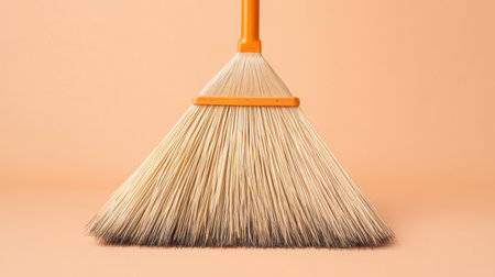This large broom features an orange handle and natural bristles, set against a peach background. Ideal for cleaning and home maintenance tasks, this image emphasizes simplicity and utility.