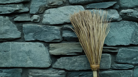 This image features a rustic broom leaning against an earthy stone wall, perfect for illustrating themes of simplicity, craftsmanship, and natural beauty in design.