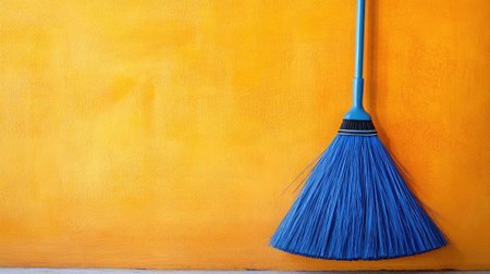 This vibrant image features a bright blue broom leaning against a vivid orange wall, ideal for home cleaning and renovation themes, showcasing simplicity and efficiency.