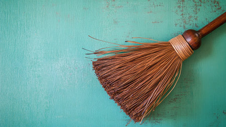 This image features a vintage broom with natural bristles resting against a textured teal background, perfect for home cleaning themes and rustic decor arrangements.