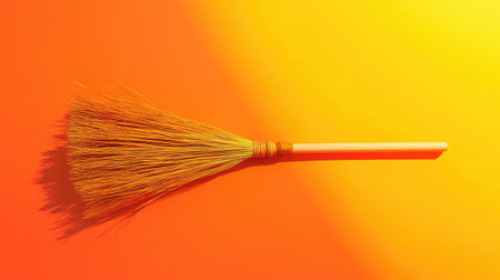 This image features a bright broom against a vibrant orange and yellow background, representing cleanliness and organization in any setting.