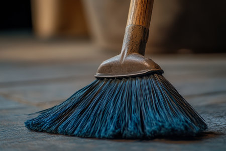 A broom with a wooden handle and natural bristles rests against a vibrant blue background, perfect for showcasing essential household cleaning tools and home maintenance themes.