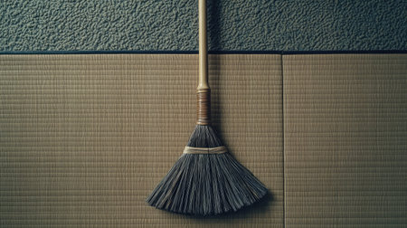 A traditional Japanese broom hangs against a tatami wall, showcasing the simplicity and elegance of Japanese design. Ideal for interior decor themes.