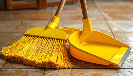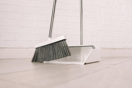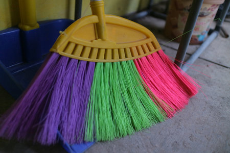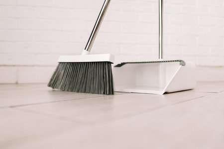 Closeup of a old-fashioned broom and plastic dustpan