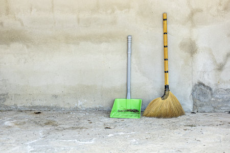 A traditional grass broom and a green plastic dustpan filled with debris stand against a weathered, textured concrete wall and dirty floor. The scene conveys a sense of everyday cleaning tasks