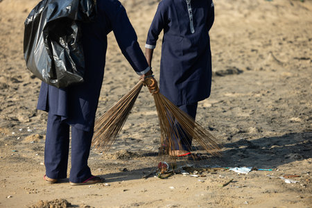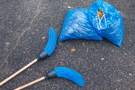 Gloves yellow and garbage blue packages with blue brooms on the road in the park