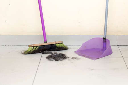 Hair after cutting on the floor. Cleaning hair with a broom in a dustpan.