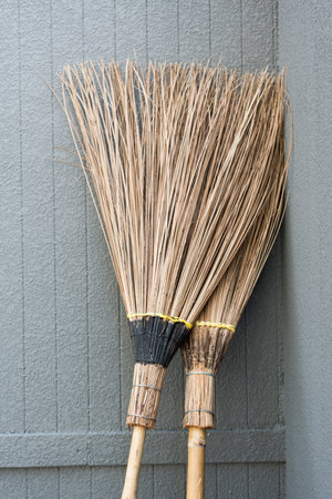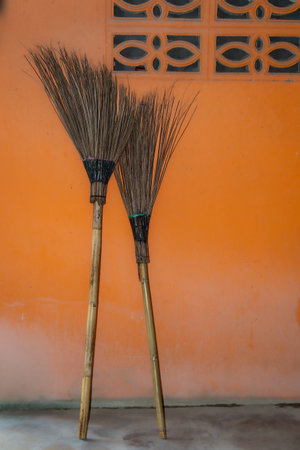 Two coconut broom lay against the wall. Coconut broom original Thai handcrafted, mop cleaning products design.