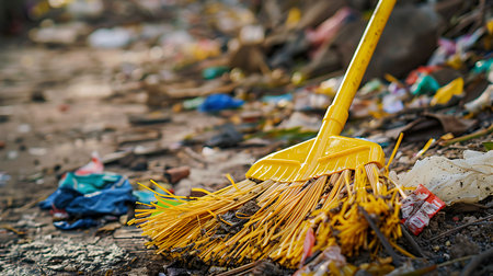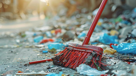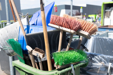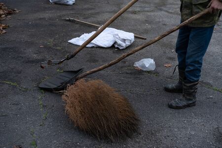 broom lying on street, volunteers cleaning up park from dust, waste and foliage