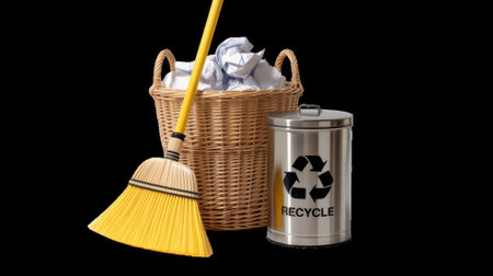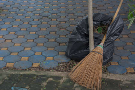 Coconut broom and black biodegradable trash bag on natural light background.