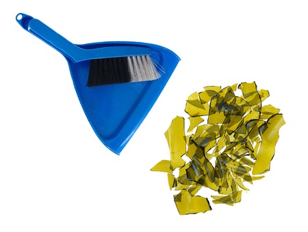 Shards of broken dark glassware on a scoop and a brush on a marble floor