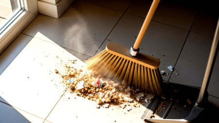 A housekeeper sweeps the broken vase with a broom
