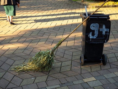 Homemade broom made from tree branches. Poor janitor. DIY tool. broom made of branches and leaves