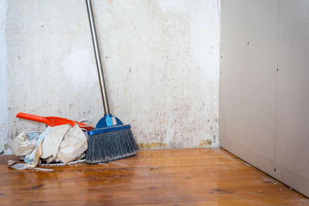 Room Renovation, construction and reconstruction with Debris, Broom and Torn Wallpaper
