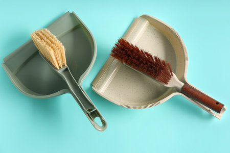 Dustpan and cleaning brushes on light background