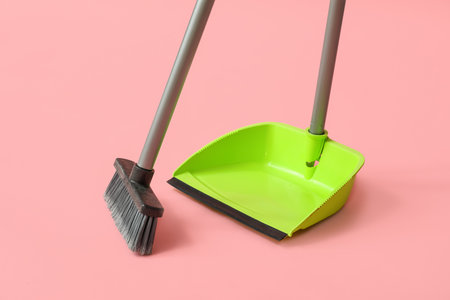 Dustpan with cleaning broom on pink background