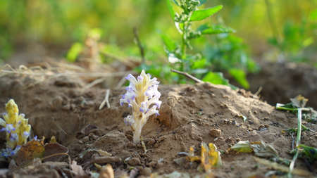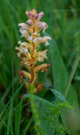 Broomrape, branched broomrape flower in the meadow in springtime .Orobanche species