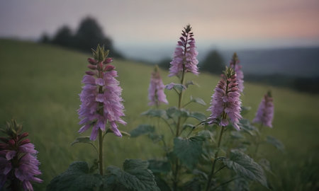 beautiful purple flowers in the meadow at sunset, soft focus