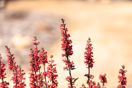 Bright fuchsia pink scarlet bugler flowers, Penstemon centranthifolius, blooms in the wild in spring in a dry field.