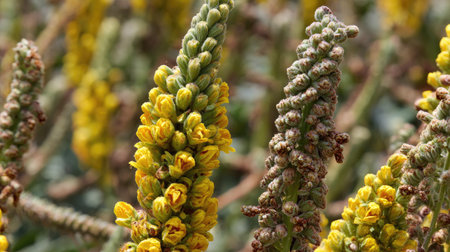 This image showcases a close-up view of multiple plant stems featuring small, bright yellow flowers and textured green buds. The composition highlights intricate details, with blurred background elements. The photograph uses natural lighting, suggesting an outdoor setting. Suitable for various design and editorial projects.