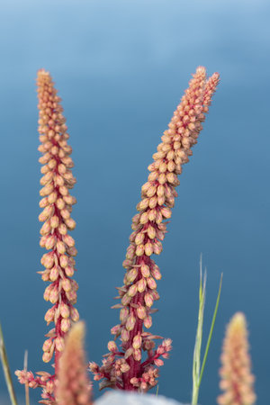Close-up of a raceme of small pinky flowers illuminated by sunlight