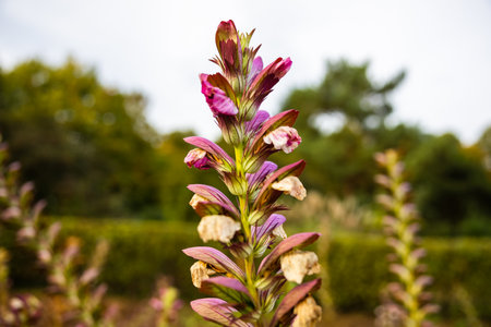 A selective focus of beautiful Acanthus flowers blooming in a garden