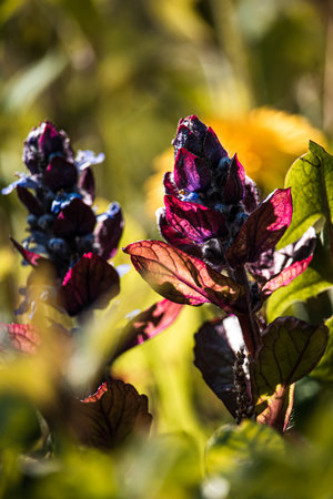 Macro of the yellow tips of some purple spike plants in the wild