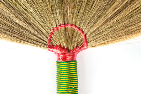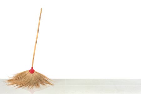 Straw broom on the white wall detail isolated