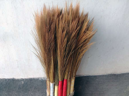Two coconut broom lay against the wall. Coconut broom original Thai handcrafted, mop cleaning products design.