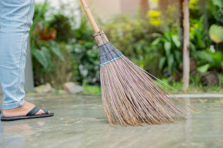 cleaning the porch with a traditional broom