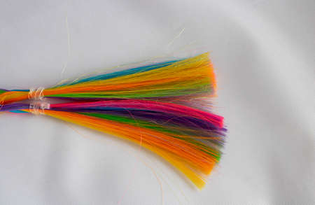 Colored artificial strands of hair. Bright multicolored braids on a white background. Beautiful abstract background.Material for weaving