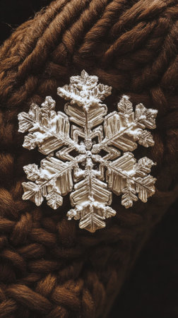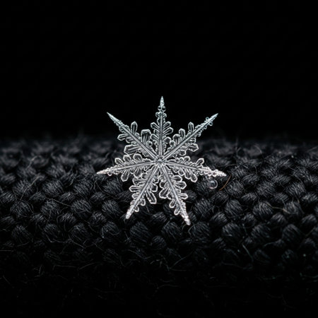 A delicate snowflake with intricate patterns rests on rich, dark fabric, showcasing its unique structure and stunning crystalline design during the winter season.