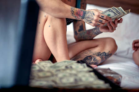 A young tattooed lesbian couple in the lingerie counting the money in a relaxed atmosphere in the bedroom. Love, lgbt, luxury, relationship