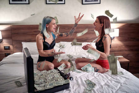 A young sexy tattooed lesbian couple in the lingerie sitting in a festive atmosphere on the bed and celebrating by throwing a bunch of money in the air. Relationship, love, together