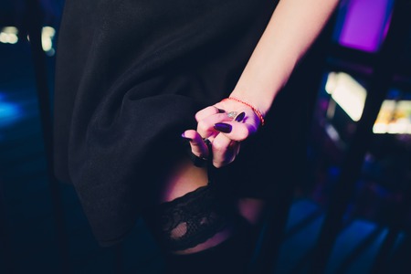 Sexy female hips in stockings behind and hand that holds a short black dress