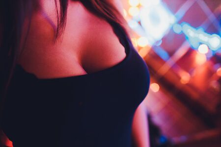 Decollete, female breast. Neckline black dress and fur collar.