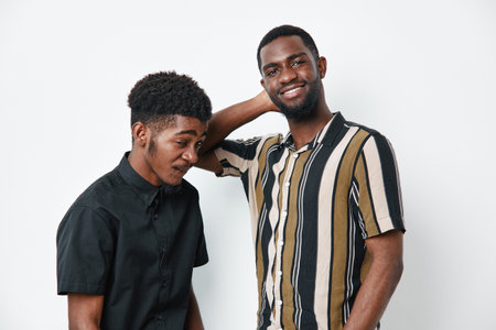 Two young black men with dark skin smiling and interacting in casual clothing on white background. Friendship, happiness and positive emotions between african american males in studio.