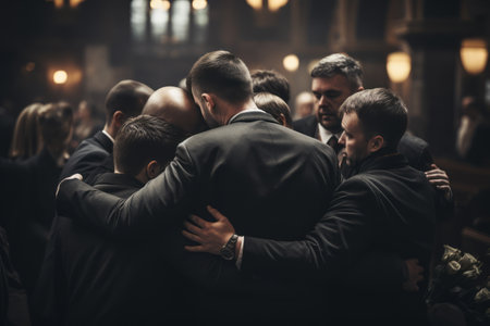 A heartwarming depiction of friends and family members embracing each other for support during a difficult moment at a funeral service. Generative Ai
