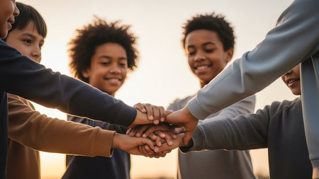 Children of diverse ethnicities stacking hands in unity at sunset.