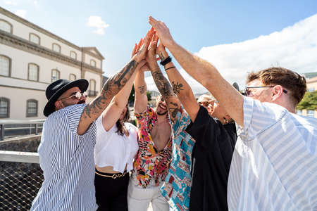 Concept of Friendship, support and teamwork People joining hands together - Young people holding hands together at outdoor.