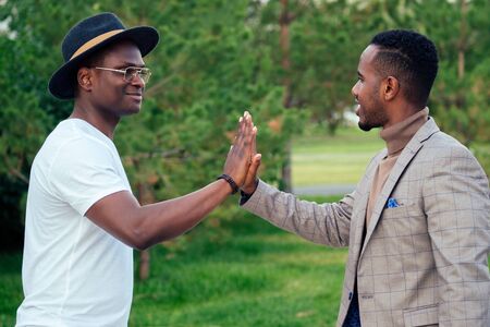 two black men in stylish suits meeting in a summer park. African-Americans friends hispanic businessman embrace high five greeting each other teamwork outdoors. successful deal concept