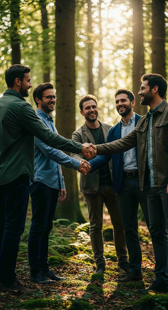 Group of happy friends having fun together in forest. Cheerful young men having fun outdoors.