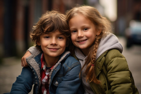 Two young children share a joyful moment, smiling brightly at the camera. Their innocent expressions radiate warmth and affection, capturing the essence of childhood.