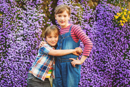 Portrait of a two happy children over sky background, little brother and sister having fun together outdoors in spring day