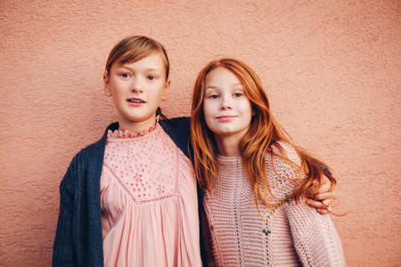 Portrait of two pretty little preteen girls wearing knitted pullover and jacket, friends playing together outside. Fashion for teens. Kneatwear